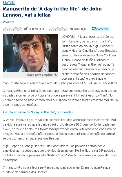 Globo on-line: Manuscrito de "A day in the life", de John Lennon, vai à leilão